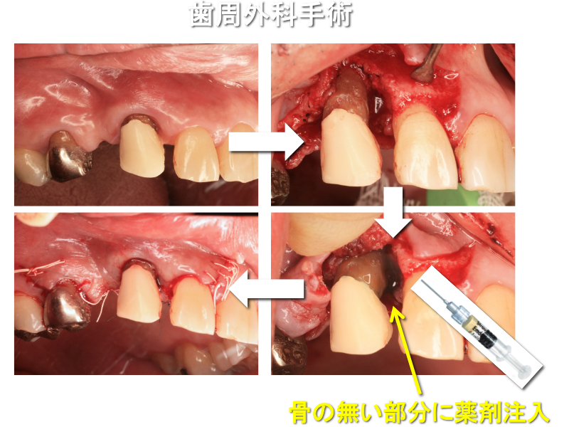 重度の歯周病によって破壊された骨は、自然に再生することはございません。歯を支えている組織が失われてしまった部分には、再生を促進する薬剤を塗り、健康な歯周組織を取り戻します。