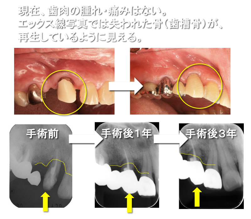 歯周組織再生療法とは歯周病により失われた顎の骨(歯槽骨)を歯周外科手術時に特殊な材料を併用し歯周組織の回復と再生を促す、いわゆる「再生治療」を言い、先進医療に分類されています。